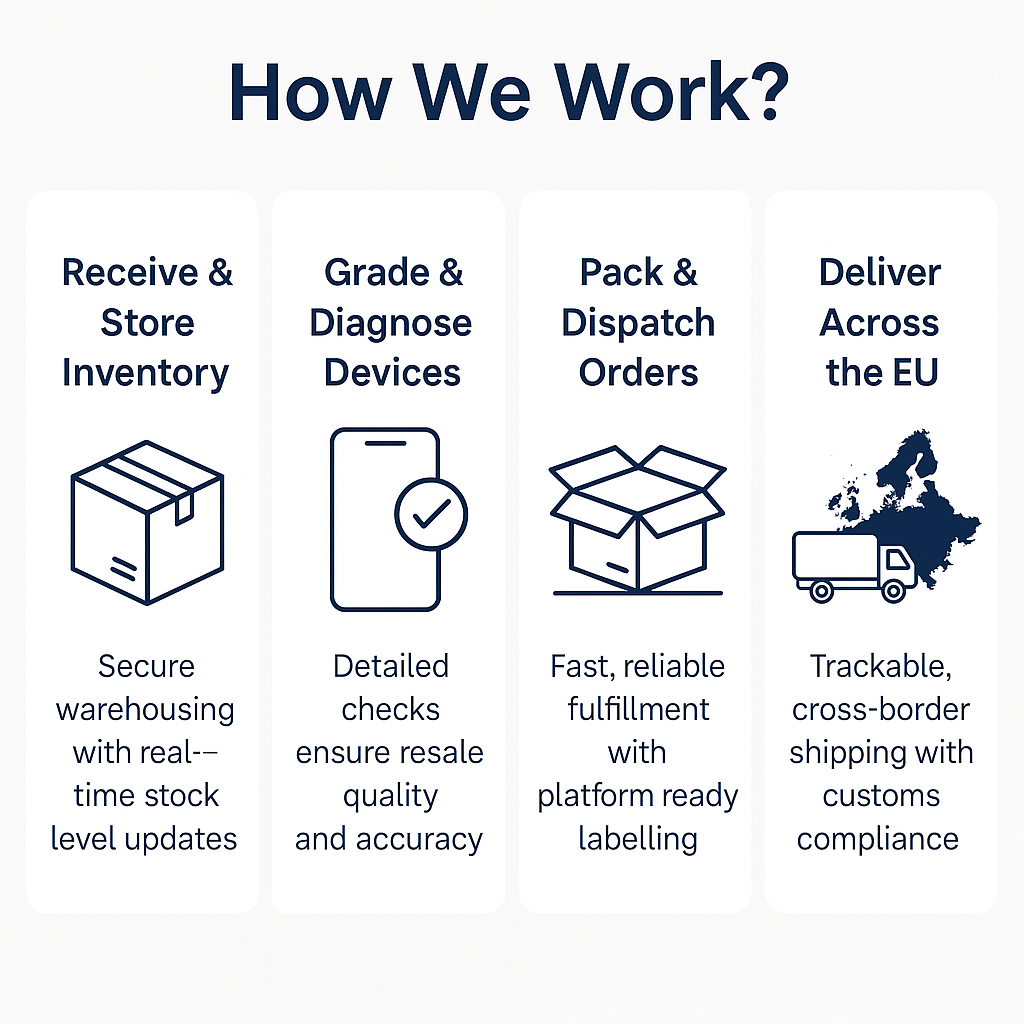 Trusted by sellers on Amazon, eBay, Refurbed and Backmarket, IRC Logistics acts as a reliable extension of your business—simplifying logistics while helping you grow.